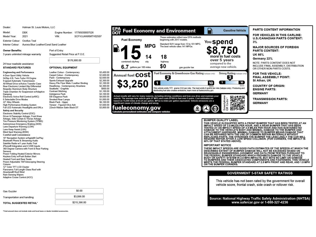Ocellus Teal 2021 Aston Martin DBX AWD 9-Speed Automatic 4.0L V8 16-Way Electric Front Bucket Seats w/Memory, Adaptive suspension, Automatic temperature control, Brake assist, Brogue Detailing, DB Elegance Pack, Electronic Stability Control, Elegant Quilting & Perforation Detailing, Embroidered Aston Martin Wings Logo Detailing, Exterior Parking Camera Rear, Heated & Ventilated Seats, Heavy Pile Leather Bound Floor Mats, Indulgence Pack, Light Olive Ash Open Pore Wood Veneer Trim Inlay, Power Liftgate, Rear Acoustic Privacy Glass, Remote keyless entry, Wheels: 22" Ribbon Satin Black Diamond Turned.