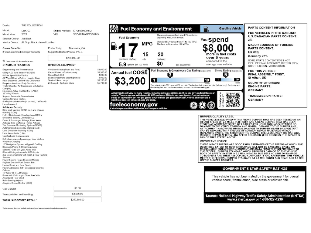 Certified. Jet Black 2023 Aston Martin DBX 707 AWD 9-Speed Automatic 4.0L V8 14 Speakers, Adaptive suspension, Auto-leveling suspension, Automatic temperature control, Brake assist, Electronic Stability Control, Heated front seats, Heated rear seats, Illuminated entry, Navigation System, Power Liftgate, Remote keyless entry, Split folding rear seat, Wheels: 23" Forged Textured Black.