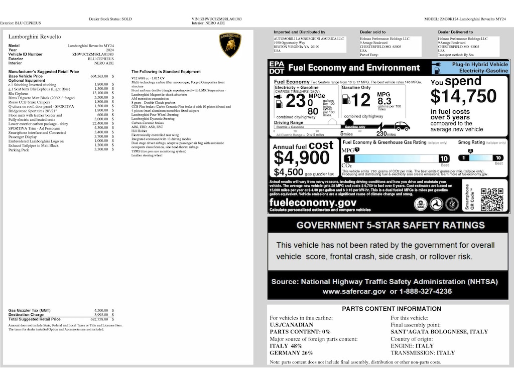 Blu Cepheus Metallic 2024 Lamborghini Revuelto AWD 8 Speed Dual Clutch V12 Adaptive suspension, Automatic temperature control, Electronic Stability Control, Exterior Parking Camera Rear, Lane Departure Warning System, Navigation System, Parking Pack, Passenger Display, Remote keyless entry, Rosso CCB Brake Calipers, Sportiva Leather Seat Trim, Wheels: 20" Fr & 21" Rr Triguero Matt Black.