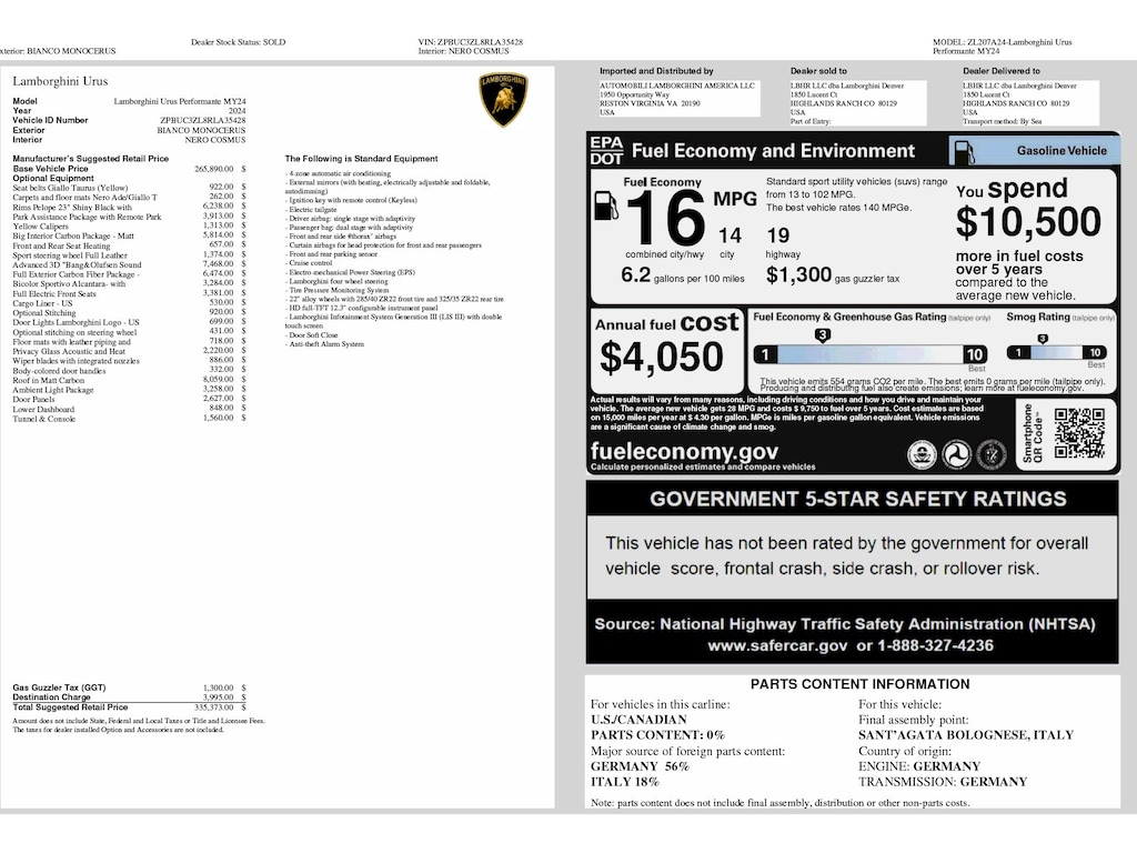Certified. Bianco Monocreus 2024 Lamborghini Urus Performante AWD 8-Speed Automatic 4.0L V8 Twin Turbocharged Advanced 3D Bang & Olufsen Sound System, Ambient Light Package, Big Interior Carbon Package - Matt, Brake assist, Electronic Stability Control, Exterior Parking Camera Rear, Full Exterior Carbon Fiber Package - Shiny, Heated Front Bucket Seats, Heated front seats, Privacy Glass Acoustic & Heat Insulated, Split folding rear seat, Wheels: 23" Pelope Shiny Black, Yellow Calipers.