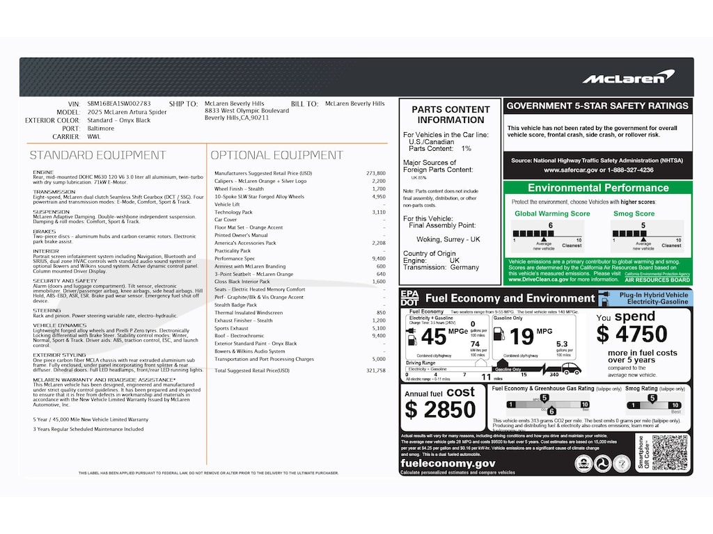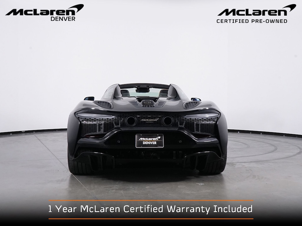 Onyx Black 2025 McLaren Artura Performance RWD 8-Speed Automatic 3.0L V6 Turbocharged DOHC 24V LEV3-ULEV50 ABS brakes, Alloy wheels, Black Pack, Compass, Convertible HardTop, Electrochromic Glazed Roof, Electronic Stability Control, Front dual zone A/C, Heated door mirrors, Illuminated entry, Interior Armrest w/McLaren Branding, Low tire pressure warning, McLaren Orange Seatbelts, Navigation System, Remote keyless entry, Sports Exhaust, Stealth Exhaust Finisher, Thermal Insulated Windscreen, Traction control, Wheels: 20" Dynamo Forged Alloy Stealth.