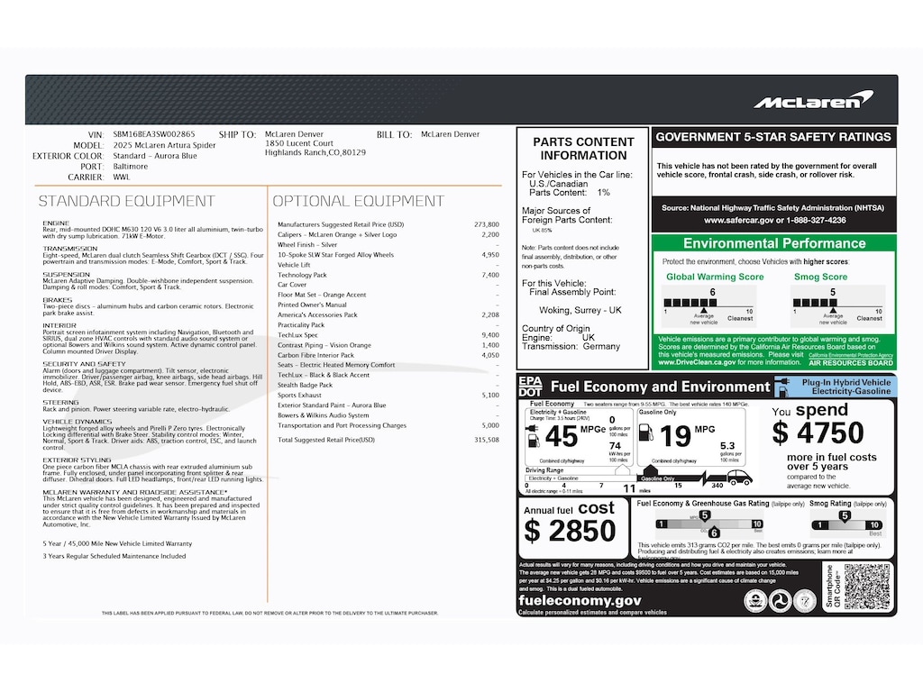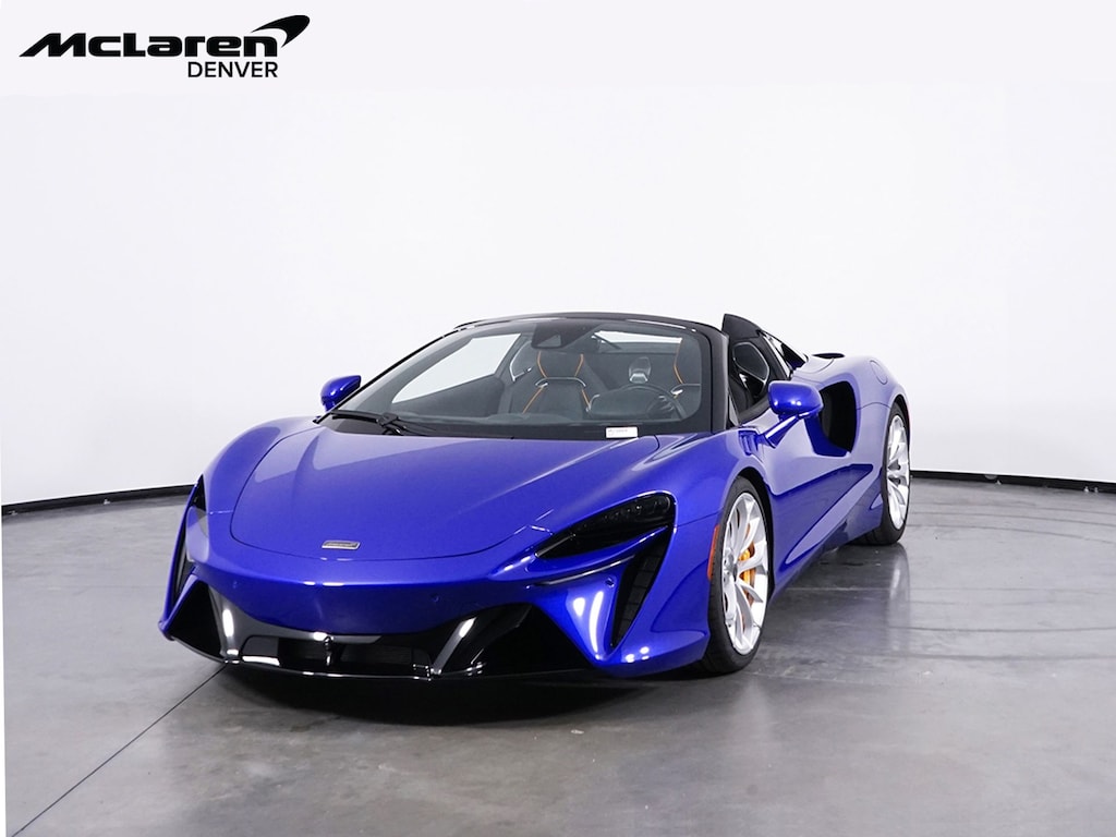 Aurora Blue 2025 McLaren Artura RWD 8-Speed Automatic 3.0L V6 Turbocharged DOHC 24V LEV3-ULEV50 Adaptive suspension, Apple CarPlay, Automatic temperature control, Bowers & Wilkins 12-Speaker Audio System, Brake assist, Electronic Stability Control, Exterior Parking Camera Rear, Front Bucket Seats, Front Center Armrest, Illuminated entry, Interior Details - Carbon Fiber Pack, Remote keyless entry, Sports Exhaust, Technology Pack, Wheels: 20" Dynamo Forged Alloy Silver.