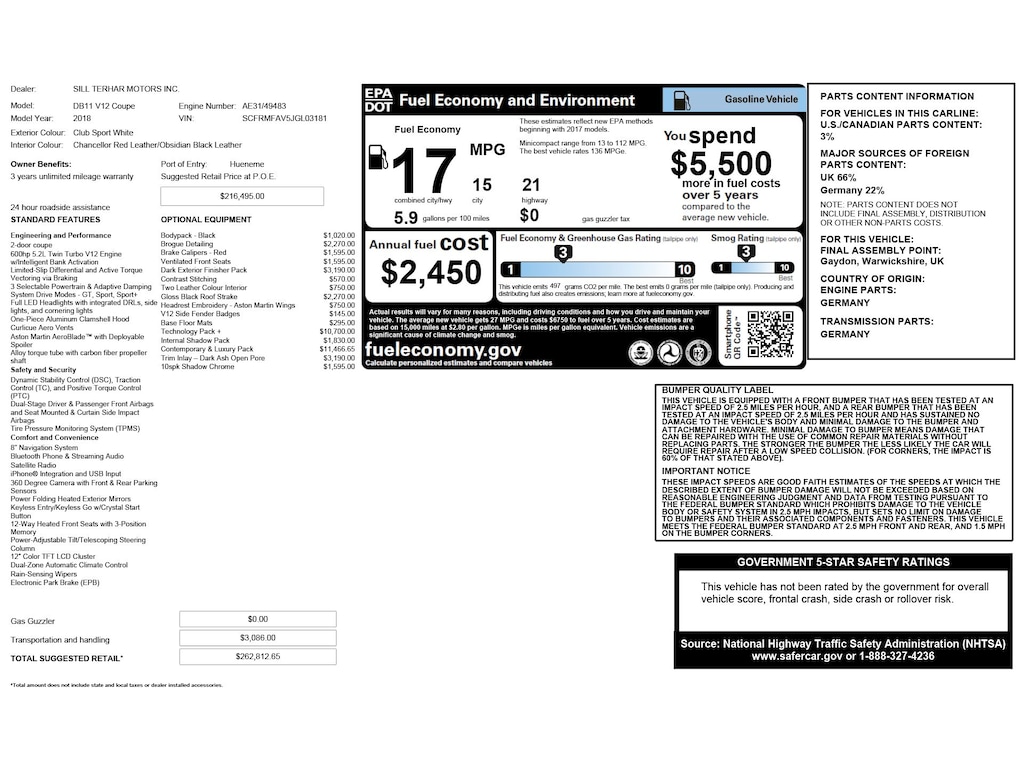Morning Frost White 2018 Aston Martin DB11 RWD 8-Speed Automatic V12 Adaptive suspension, Automatic temperature control, Brake assist, Electronic Stability Control, Exterior Parking Camera Rear, Heated Front Bucket Seats, Heated front seats, Navigation System, Power windows, Wheels: 20" 10-Spoke Silver Diamond Turned.