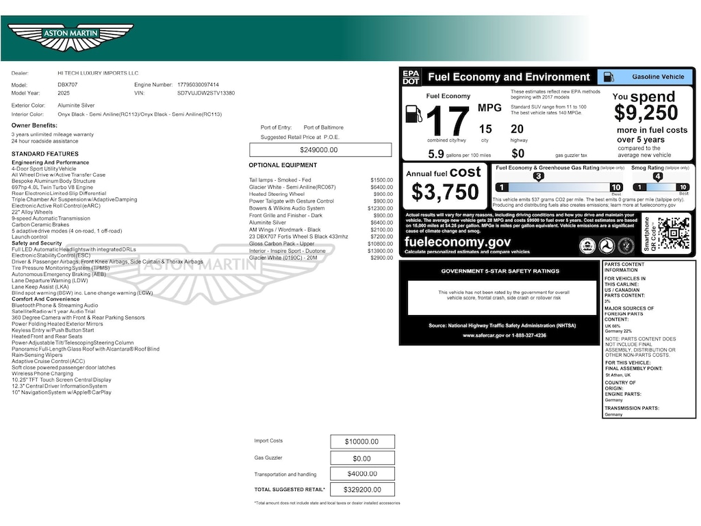 Aluminite Silver 2025 Aston Martin DBX 707 AWD 9-Speed Automatic 4.0L V8 16-Way Electric Front Seats w/Memory, Adaptive suspension, Bowers & Wilkins Audio System, Brake assist, Electronic Stability Control, Gloss 2x2 Twill Carbon Fiber Upper Exterior Body Package, Heated & Ventilated Seats, Heated front seats, Heated rear seats, Heated Seats, Heated Sport Steering Wheel, Inspire Sport Environment - Duotone, Leather Headlining w/Alcantara Roof Blind, Power Liftgate, Remote keyless entry, Semi-Aniline Leather Seat Trim, Wheels: 23" Forged Satin Black Diamond Turned.